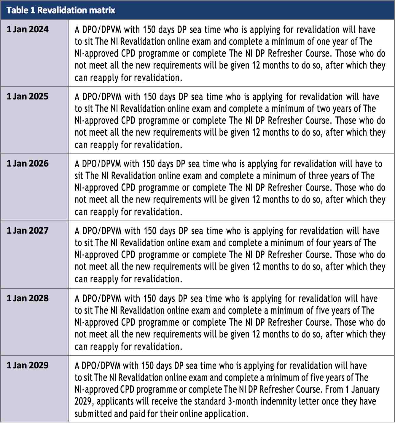 DPVM with No DP sea time or less than 30 days must complete The NI DPVM Revalidation Course. When revalidating using the Revalidation Course for a second or subsequent time, the DP technical staff must follow the rules as per the standard with respect to sea time requirements.